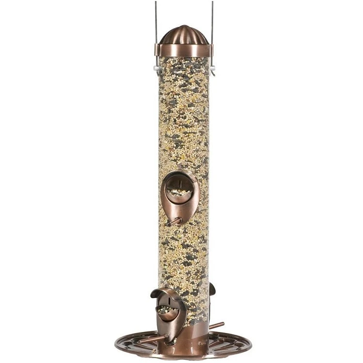 This pretty tube feeder has a 1.8 LB seed capacity, and can be used with mixed seed, sunflower, or thistle/Nyjer seed. The 4 metal feeding Swivel Ports can be turned to accommodate thistle/Nyjer and finch mix or sunflower and mixed seed. The antique copper finish on the cap, ports, perches & base make up a quality feeder. The removable, bird-friendly tray at the base of the feeder serves to catch seed & shells, or as a larger perch. It has drainage holes to keep the seed fresh.