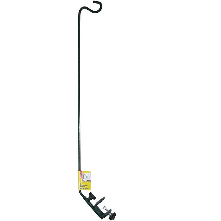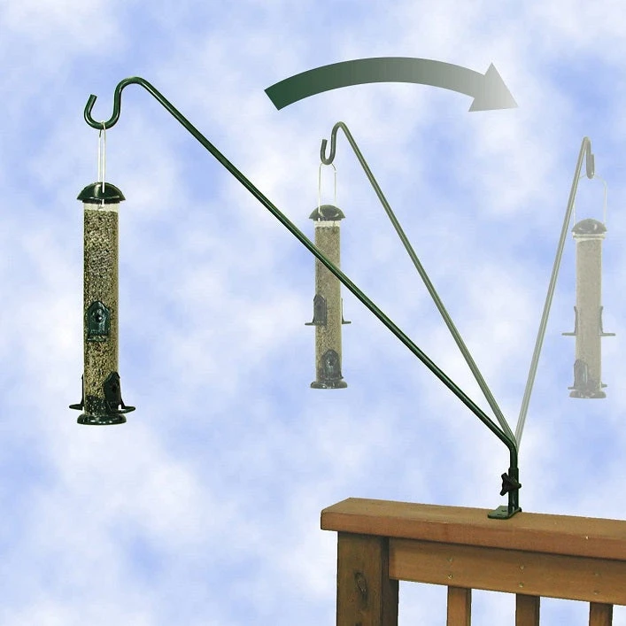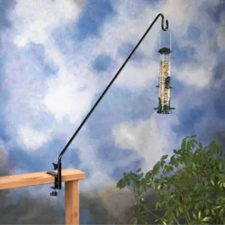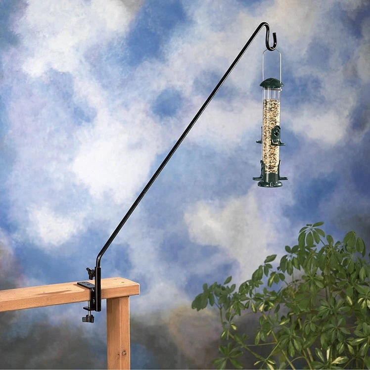 Do you wish your bird feeder was situated closer to the house so you could see the birds better as they feed? This 27″ extended-reach deck hook easily clamps on your deck rail by hand-tightening the knob- no tools needed. Great for hanging a seed or suet feeder, nectar feeder, flower basket, hanging birdbath, garden light or accessory. The adjustable bracket allows you to easily turn the arm 360 degrees- position the hook away from the deck for clear viewing & a cleaner deck. The clamp is constructed of solid steel & powder coated with weather-resistant finish, and it fits onto most horizontal deck railings- up to 2″ thick.