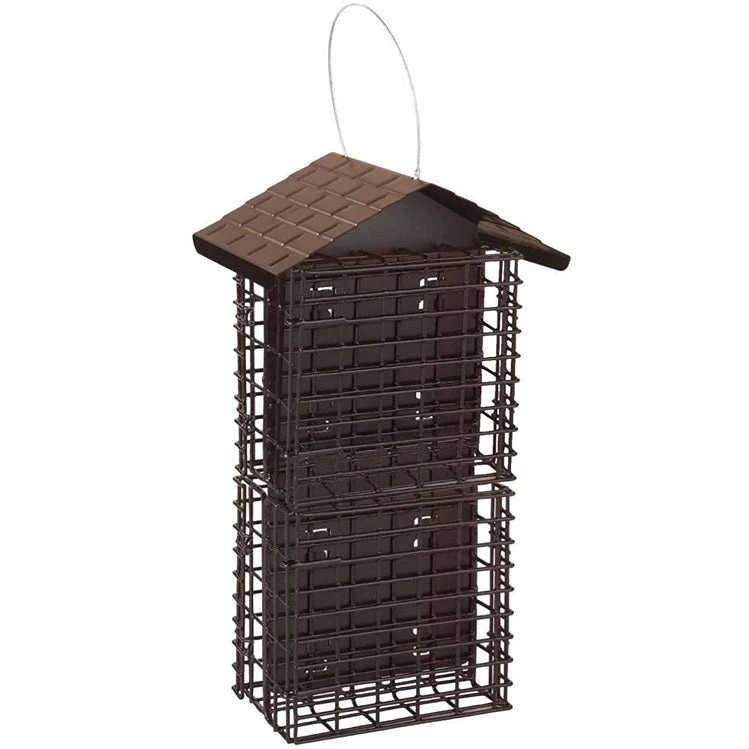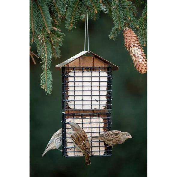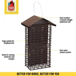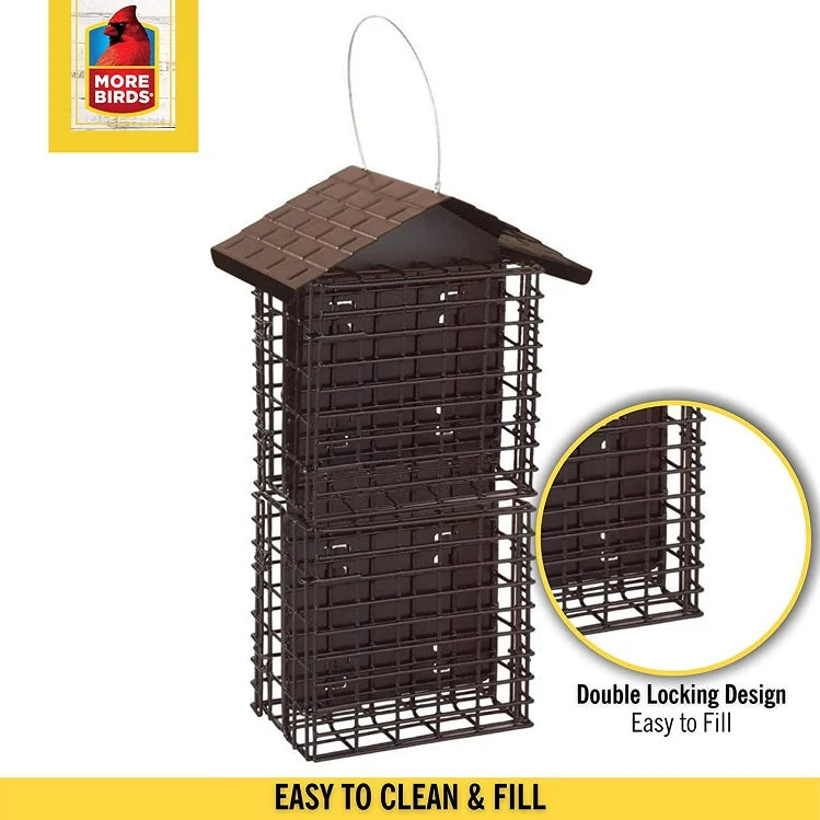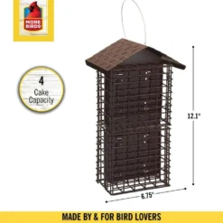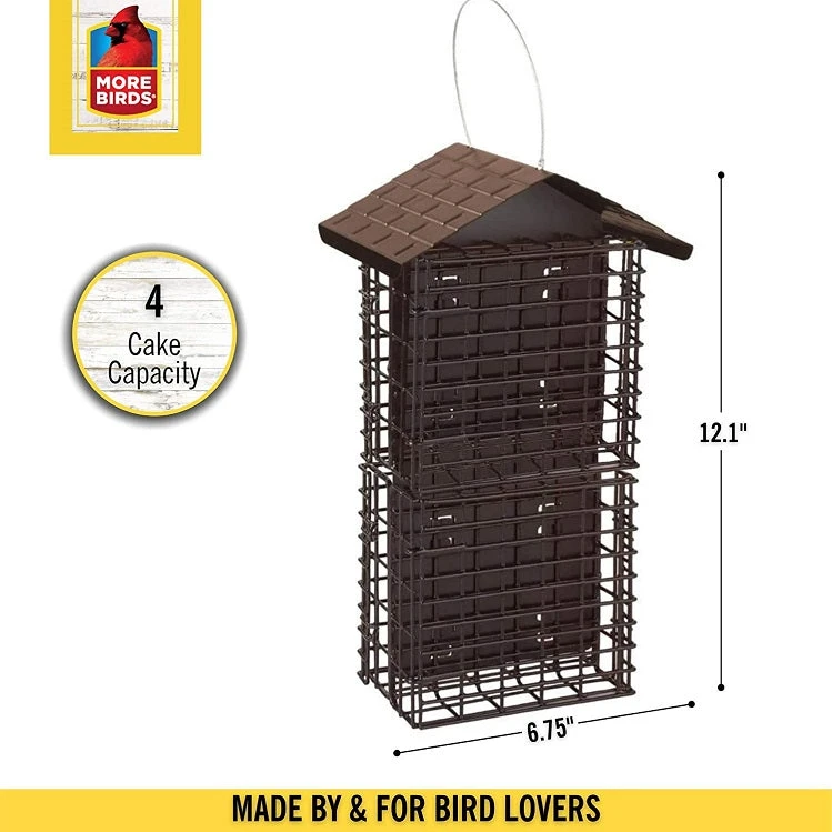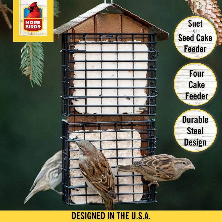 The More Birdsยฎ Four Cake Suet Buffet with Weather Guard is the perfect way to offer healthy treats to woodpeckers, nuthatches, chickadees and more! 4 independent cages hold 1 suet cake each, providing more feeding space for clinging birds. The cages feature an easy-open, double-locking closure system. The shingle-patterned roof design diverts rain & snow, helping keep suet cakes dry. Its cage grid is designed with clinging birds in mind, but itโs not just for suet! Itโs also perfect for small seed cakes, nesting materials in spring & oranges in summer. Woodpeckers also use the bottom cages as a tail-prop when feeding! Constructed of solid steel with a weather-resistant, brown powder-coated finish, the Four Cake Suet Buffet is a quality suet feeder that birds will love.