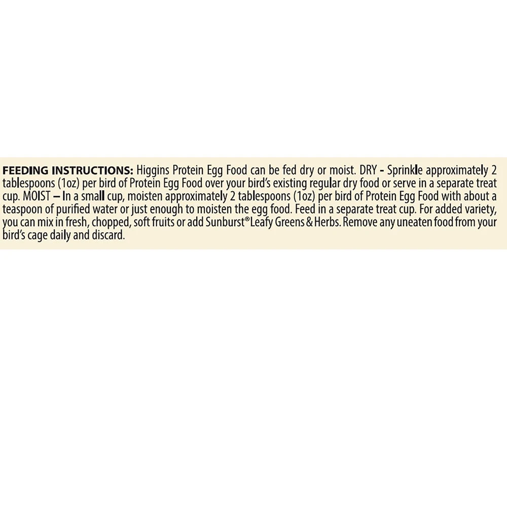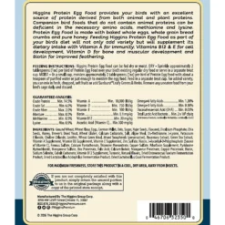 Higgins Protein Egg Bird Food, Formulated with real baked eggs plus whole grain bread, wholesome grains and seeds, it provides protein from animal and plant sources to supplement your bird’s daily food. The extra protein is great for nestlings and birds that are nesting or moulting. It’s enhanced with vitamins, minerals, omegas and superfoods like algae and green tea extract to support growth and development, healthy muscles, bones and feathers. Plus, it’s made in the USA and can be fed to all birds.
