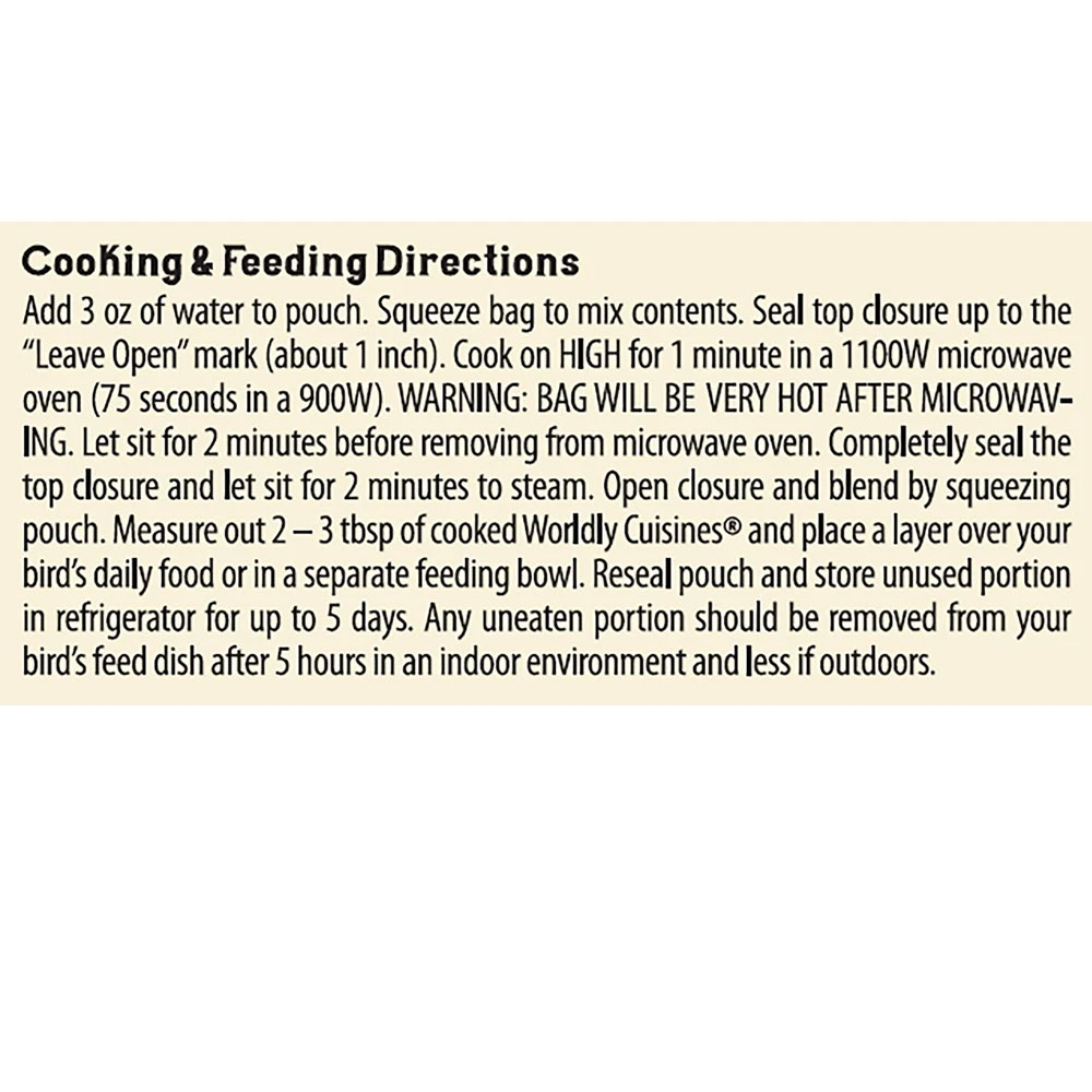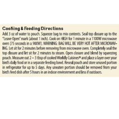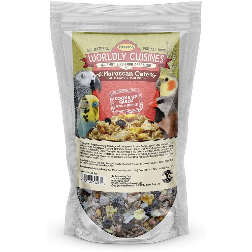 Higgins Worldly Cuisines Moroccan Café Bird Treats, Who said bird food has to be dry and boring? Just add a little water to a Higgins Worldly Cuisines pouch, microwave it briefly, and voila you’ve got a moist and delicious rice-and-couscous dish laden with split peas, apples, coconut, raisins and ginger. You can serve it alongside, or on top of, your pretty girl’s usual meals to give her an exciting little break from routine.