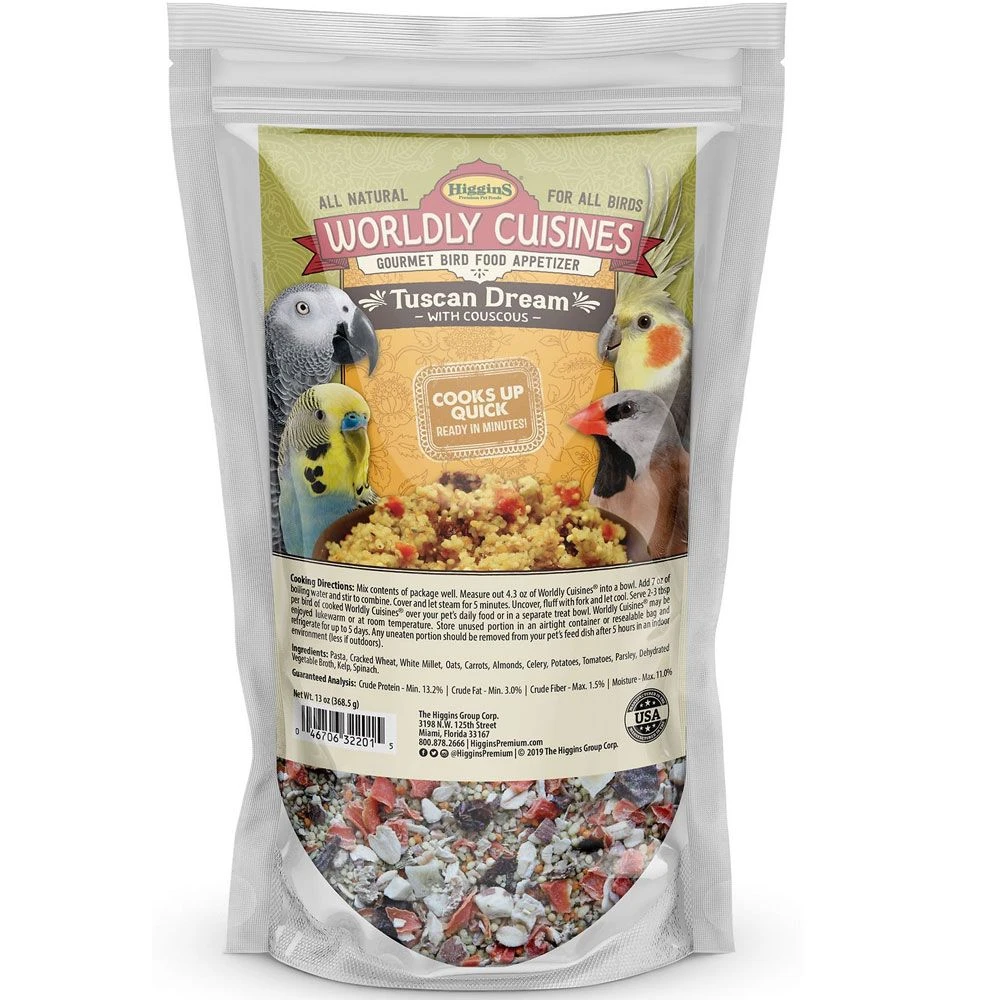 Higgins Worldly Cuisines Tuscan Dream Bird Treats, Who said bird food has to be dry and boring? Just add a little water to a Higgins Worldly Cuisines pouch, microwave it briefly, and voila you’ve got a moist and delicious couscous dish laden with tomatoes, carrots, celery, parsley and spinach. You can serve it alongside, or on top of, your pretty boy’s usual meals to give him an exciting little taste of Tuscan romance.