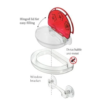 The Jewel Box window hummingbird feeder brings beautiful hummingbirds right to your window for easy viewing. It is simple to fill and to clean, so you can easily provide a healthy oasis for thirsty hummingbirds. Raised flowers are designed to divert rain, keeping the nectar clean and undiluted. The bright red cover attracts hummingbirds, even from a distance. Once there the HighView perch invites them to rest comfortably as they drink from any of three feeding ports while you watch from your window. Features a generous 8 oz. capacity, sturdy poly carbonate construction, and a suction-cup mounted bracket. You can use this feeder with or without the ant-moat, which blocks crawling insects. It makes a great gift, or addition to your own backyard birding collection.