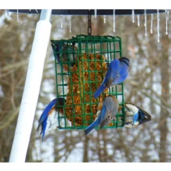 Offer the cake in a large suet feeder or on a platform feeder, where it can’t be kicked all over the place like loose seed can. The large size lasts a long time and attracts loads of birds.