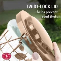 To offer defense against squirrels, this feeder boasts a few great features. First, is the feeder’s metal wire cage design. The cage creates a barrier around the ports which makes it harder for squirrels to access the seed. The cage is made of metal to prevent squirrel chewing and damage. This feeder also features a convenient twist-lock lid which prevents squirrels from easily opening the feeder and accessing the seed inside.