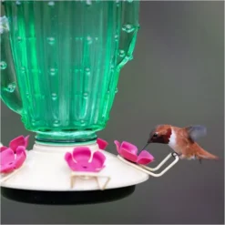 Presenting the patented Top-Fill bottle you love with a charming new design, the Perky-PetĀ® Cactus Top-Fill Glass Hummingbird Feeder will become a favorite of everyone. The wide-mouth opening, and Top-Fill design ensure that filling is always easy and mess-free! While you save time from filling and cleaning, hummingbirds wonāt be able to resist the feederās lifelike hollyhock-inspired feeding ports. They are soft and flexible just like the flowers they flock to in nature! The flowersā tapered stem design also acts as a natural bee guard to keep bugs out. Hummingbirds are sure to be on their way!