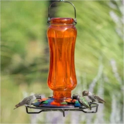 Wrap-around Perch—Orioles are often seen hanging out on tiny hummingbird feeders to get a taste of the nectar inside. However, hummingbirds are much smaller than orioles, and therefore, their feeders are smaller as well. It can be rather awkward and uncomfortable for orioles to drink from hummingbird feeders, so why not provide them with a feeder that’s made to accommodate them! The Carnival Glass Vintage Oriole Feeder features a unique circular wrap-around perch that offers plenty of room for orioles to comfortably sit and dine.