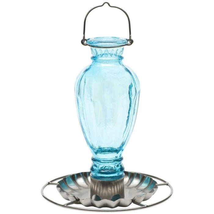 The traditional vase style glass bottle has a beautiful, blue luster finish giving it a unique sheen just like a pool of fresh water. The delicate embossed details surrounding the neck and top of the bottle offer added elegance to this antique style waterer.