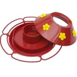 This hummingbird feeder features a durable transparent glass bottle with a wide mouth opening for easy filling and cleaning. The feeder’s design also includes six feeding stations, each with a bright-yellow, flower-shaped bee guard to protect the nectar supply. The feeder comes with a circular perch all the way around the base of the feeder for birds to rest upon, along with a built-in ant moat on the top of the feeder. With a big, 30-oz capacity, there will be plenty of sweet nectar to go around with this feeder.
