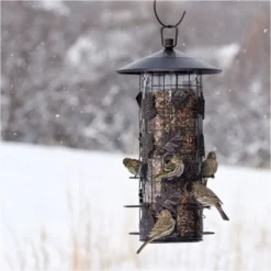 Birds and bird lovers alike can’t deny the charm of this delightful feeder. The bronze-colored cage is adorned with an attractive leafy design that will look at home in any yard. The metal leaves double as port covers on the weight-activated cage. In addition, the metal is finished with a powder coating to enhance the rustic look, while also ensuring rust resistance.