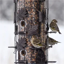 To offer defense against squirrels, this feeder boasts multiple great features. First, is the feeder’s weight-activated Seed Shield™, which is calibrated to support the weight of birds but not squirrels. When squirrels try to gain access to the perches, the ornamental leaves close off the ports under their weight. Birds can sit on every perch without activating it. In addition, the twist-lock cap prevents squirrels from lifting the lid, while the metal frame discourages chewing around the ports.