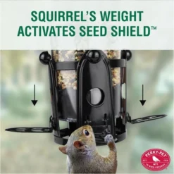To offer defense against squirrels, this feeder boasts multiple great features. First, is the feeder’s weight-activated Seed Shield™, which is calibrated to support the weight of birds but not squirrels. When squirrels try to gain access to the perches, the ports close off under their weight. Birds can sit on every perch without activating it. In addition, the Sure-Lock™ cap prevents squirrels from lifting the lid, while the metal frame discourages chewing around the ports.