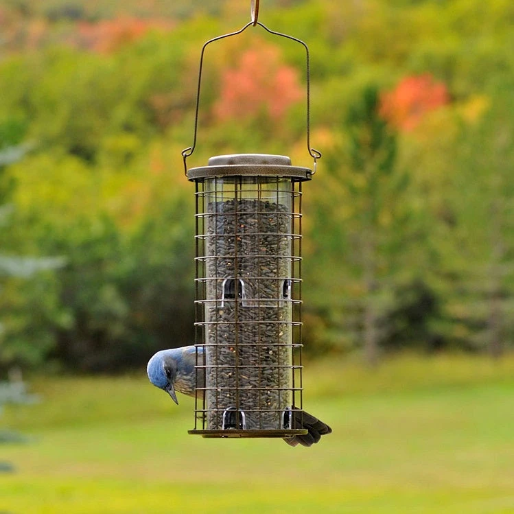 This pretty squirrel resistant bird feeder features a wire cage/barrier around the seed that protects against squirrel damage. With eight feeding ports, there is plenty of room for your feathered friends to cling and feast. The feeder is designed for easy filling and cleaning, so you can offer your birds a fresh, safe place to dine at all times. The twist-lock top prevents the squirrels from gaining access to the seed, and the clear seed container makes it easy to monitor the seed level. Pretty and functional, this feeder makes a great gift – or use it in your own yard!