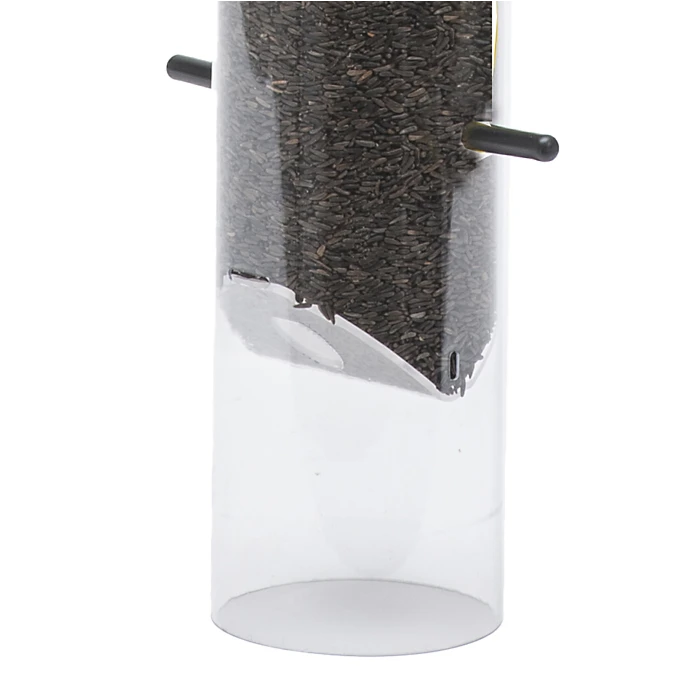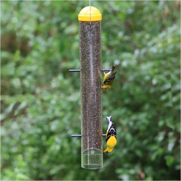 Darling and acrobatic, goldfinches have no problem feeding while perched upside down. This long, tube-shaped feeder caters to that unique ability, by providing upside down feeding stations with the perches positioned above, rather than below, each feeding port. With a feeding station all their own, goldfinches can leisurely dine without being bothered by other birds.