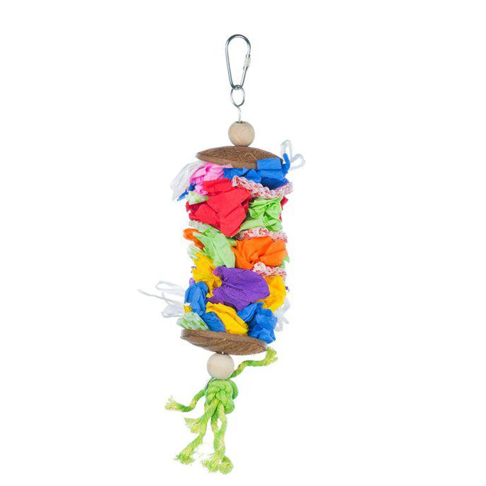 Prevue Laundry Day Bird Toy is a colorful, dangling pull toy designed for satisfying preening instincts and discouraging plucking in your bird. Laundry Day is made from Cotton Rope, and assorted multicolor paper providing your bird with mental stimulation and hours of fun. The coconut shells rugged texture and smooth wooden and plastic beads are perfect for beak and tongue exercise. All materials are 100% pet safe with non-toxic, food-grade colors and connect easily to cage with stainless steel quick-link attachments actual measurements may vary slightly. As always, supervise birds at play. Our Laundry Day toy measures 3″ in diameter and 8 ยฝ” high. Ideal for small, and medium birds measuring 7″ to 18″ beak to tail.
