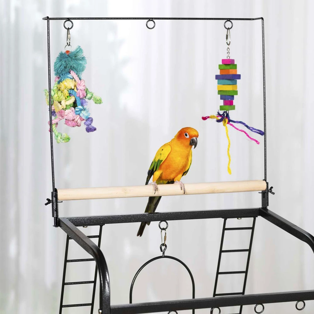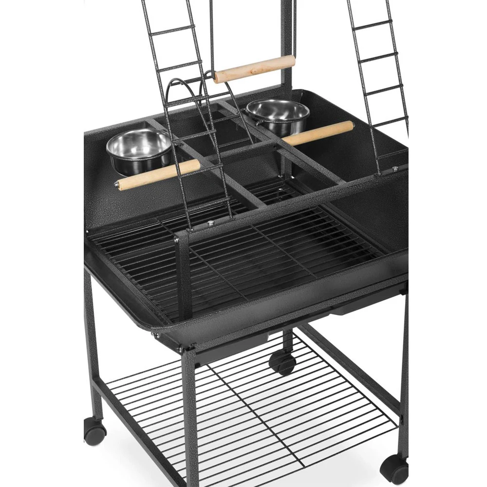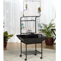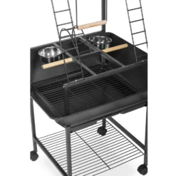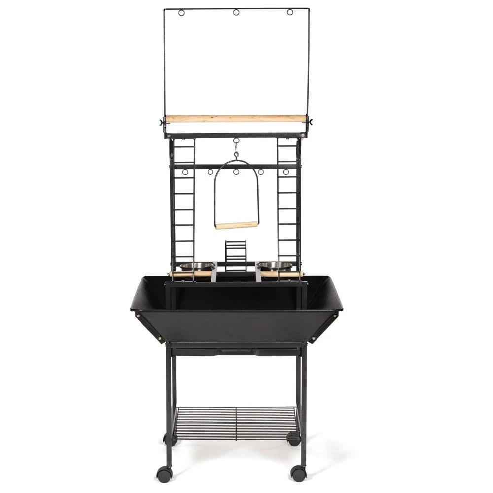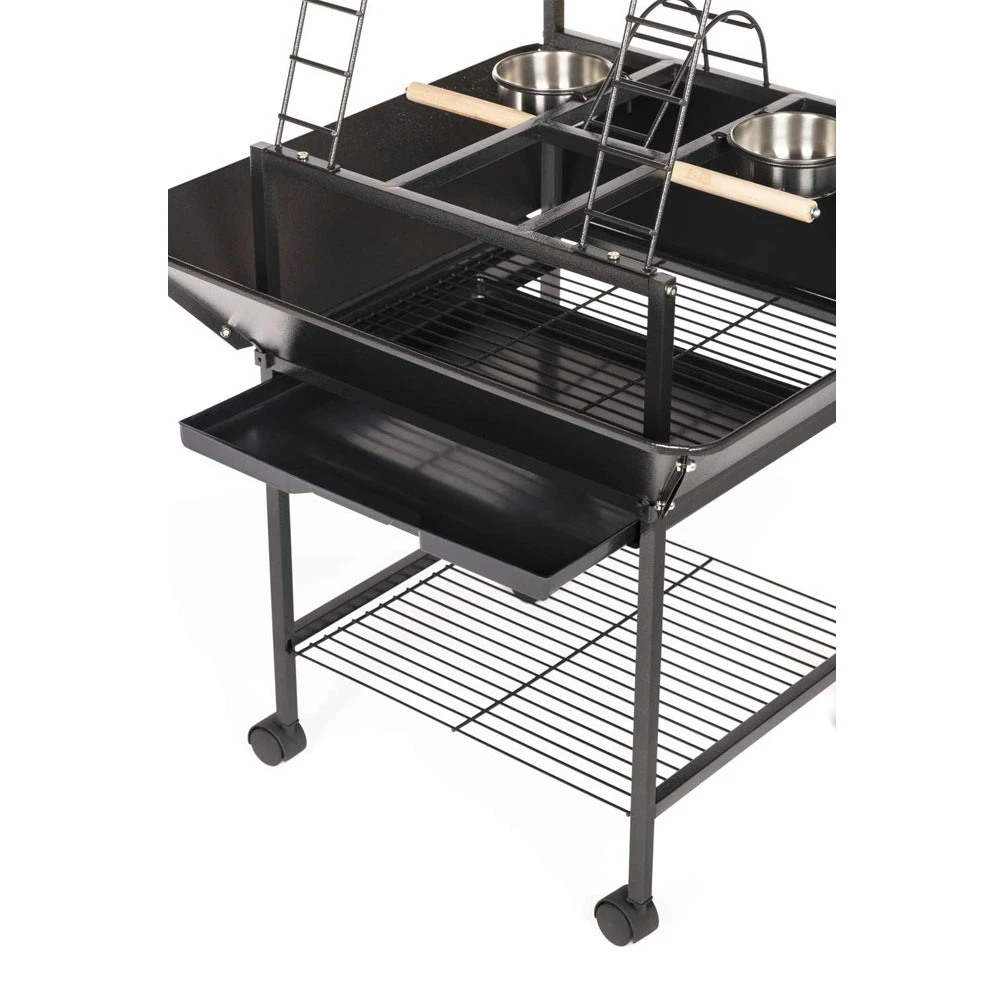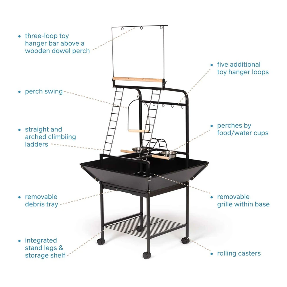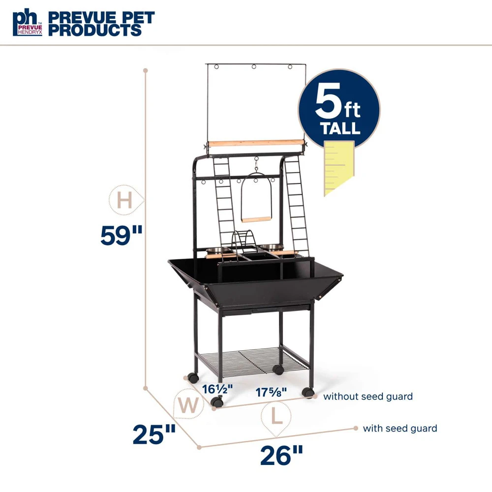 Prevue Small Parrottiel Playstand Bird Cage Accessory includes 8 hooks for hanging multiple toys and treats, along with 3 ladders for plenty of space to climb. A swing is even included for more playing fun. Double cups provide room for food, water and treats, and the easy-rolling caster stand lets you easily move the playstand from room to room or indoors to outdoors. A pull-out tray, along with the rounded corner seed guard, make cleaning quick and easy, while the bottom storage shelf is perfect for keeping extra food, treats, toys and cleaning supplies. Our Small Parrot Playstand is available in a non-toxic, powder-coated, black hammertone finish and measures 17-โ ” long, 16-ยฝ” wide and 59″ high to the top of the toy hook.