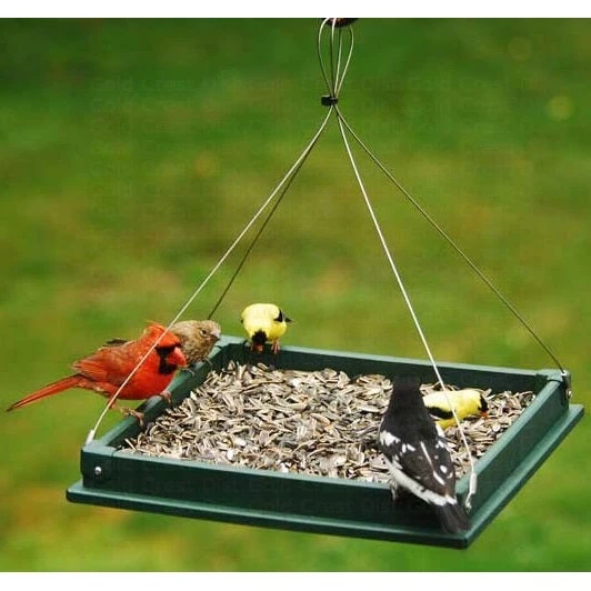 Recycled Plastic large hanging platform feeder with powder coated steel screen. Perfect for all types of birds, especially those that prefer to feed flat footed, such as Cardinals. Easy to clean and disinfect.ย