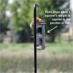 Placement to deter squirrels: The key to keeping a bird feeder successfully squirrel-proofed is the placement. Place your bird feeder 4 feet from the ground and 8 feet from anything a squirrel can jump from. When hanging from a pole by a hook, it is recommended that the hook have at least a 16” distance from the pole. Placing a baffle on the pole or having a caged feeder will also help to ensure squirrel-proof success.