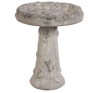This sturdy little aged-stone colored birdbath is decorated with a charming leaf and flower scene featuring hummingbirds. A beautiful and useful garden accent for bird lovers.